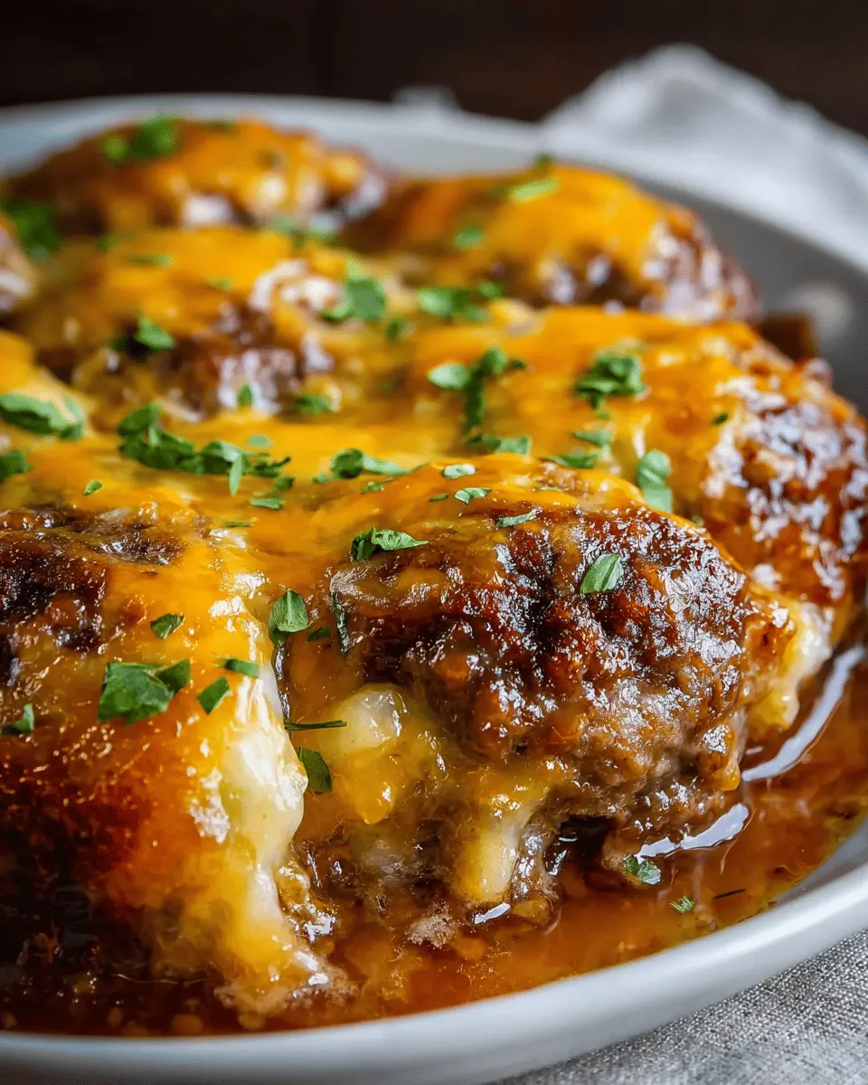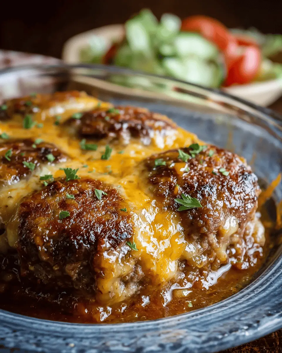 If you’re a cheese lover, why not incorporate a cheesy twist? Before pouring over the gravy, sprinkle a generous layer of shredded cheese—like cheddar or mozzarella—on the patties. As the Amish Hamburger Steak Bake bakes, the cheese will melt beautifully, creating a gooey, flavorful topping that's sure to impress. Not only does this add an extra layer of richness, but it also turns a comforting dish into a cheesy masterpiece. Explore different cheese combinations to find your favorite!