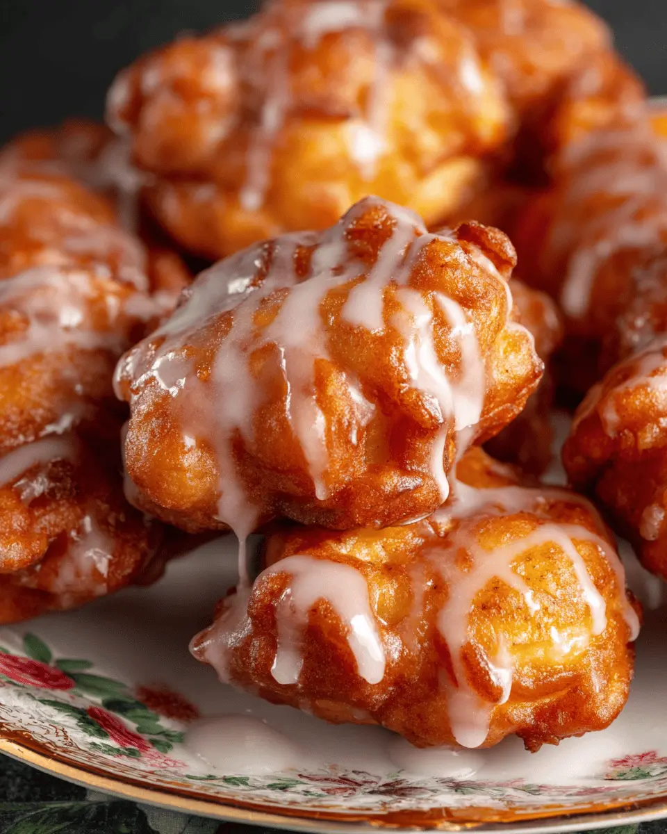 Once the fritters are slightly cooled, dip them into the glaze or drizzle it over the top with a spoon. Let the glaze set for about 10 minutes before serving—this will give your fritters the perfect glossy finish that makes them look as good as they taste.
