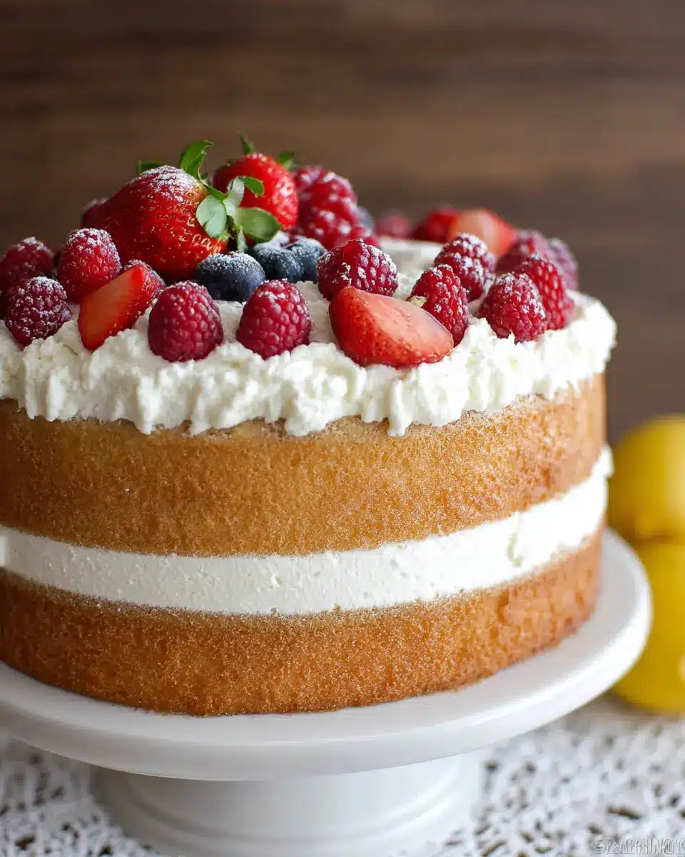 This lemon whipped cream brings an airy sweetness that perfectly complements the berries and the vanilla cake layers.