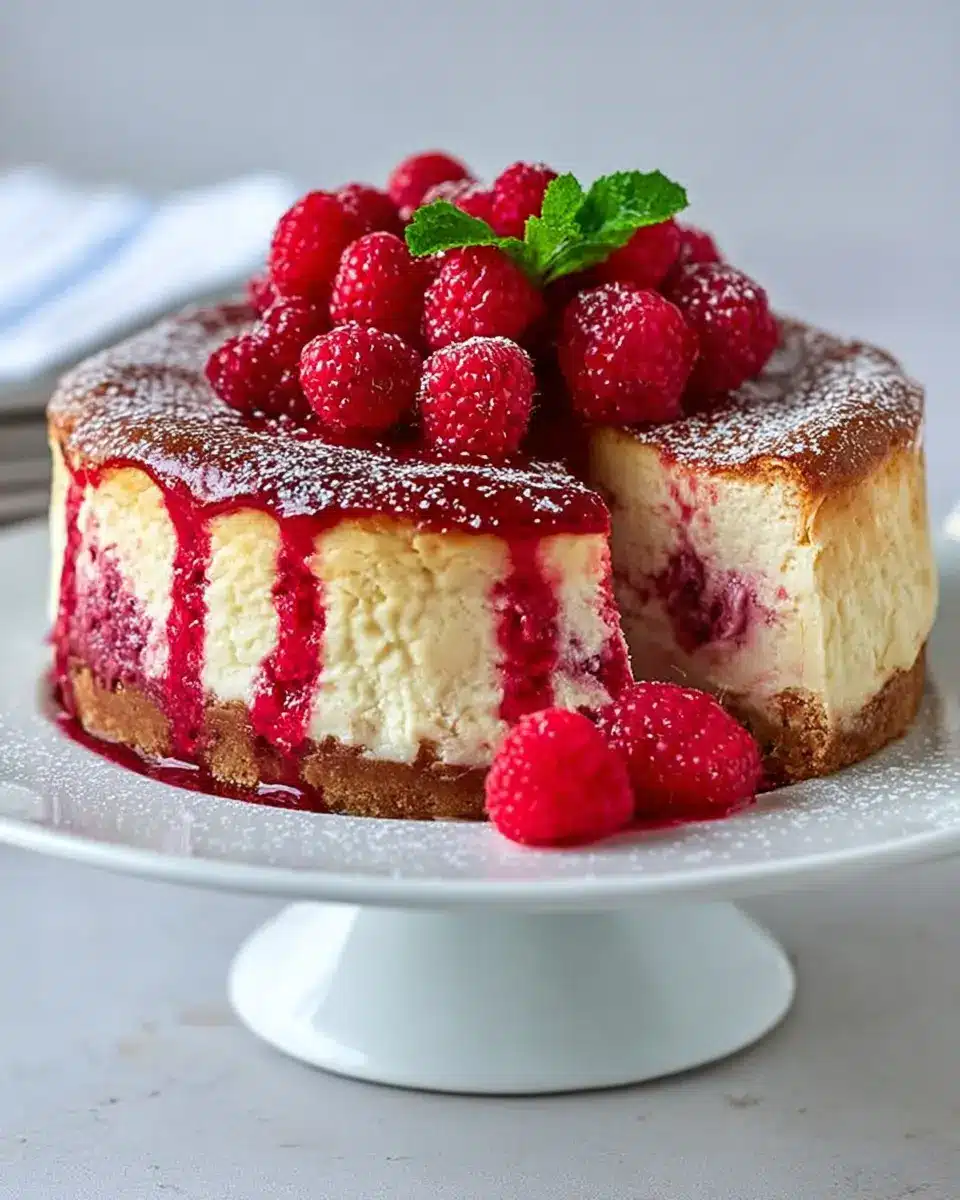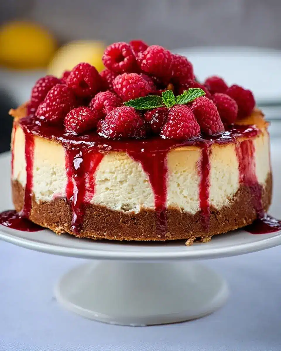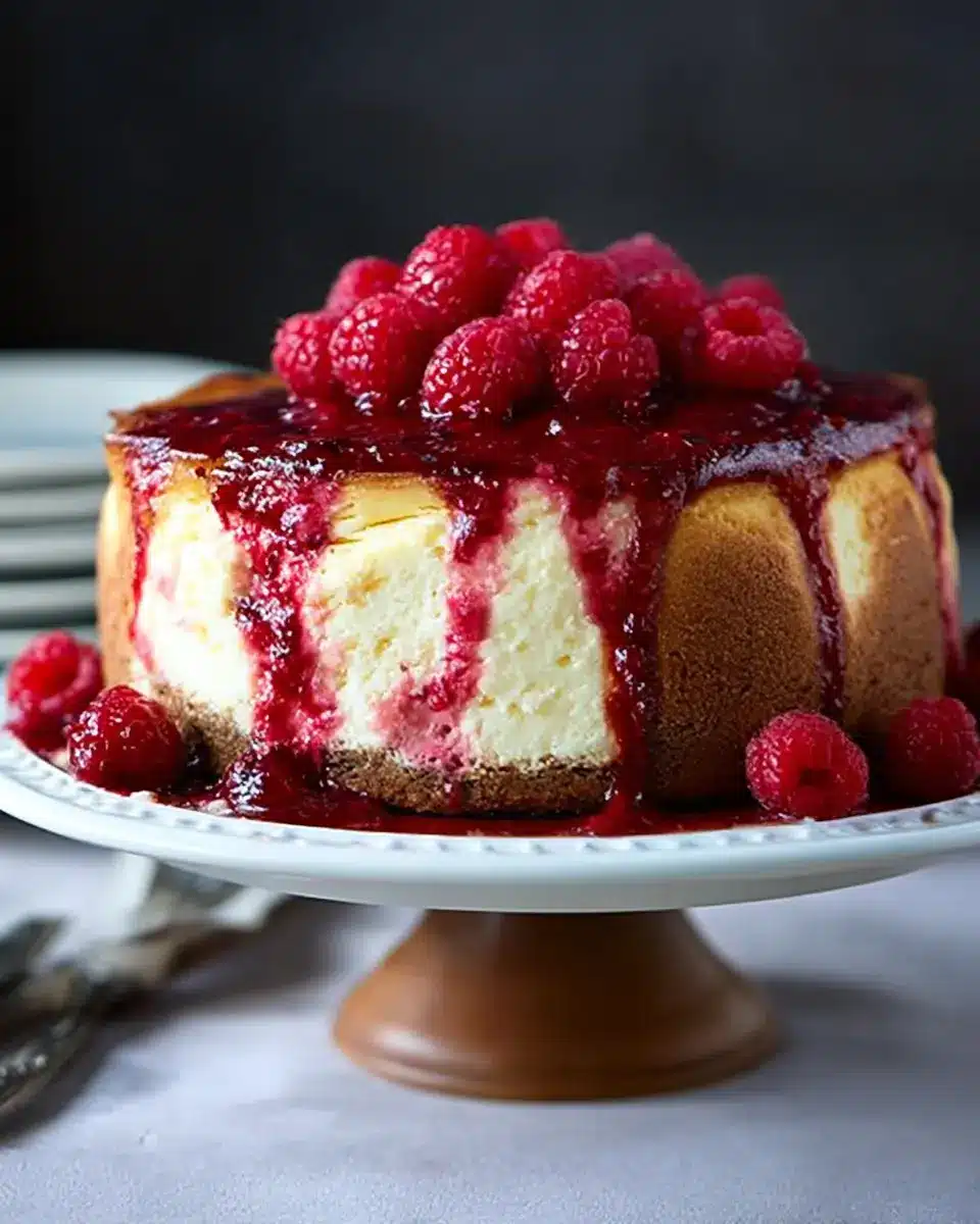 When it’s time to serve, loosen the edges of the cheesecake with a knife, release the springform, and pour the vibrant raspberry sauce over the top. Finish with fresh raspberries for that perfect touch of beauty and flavor!