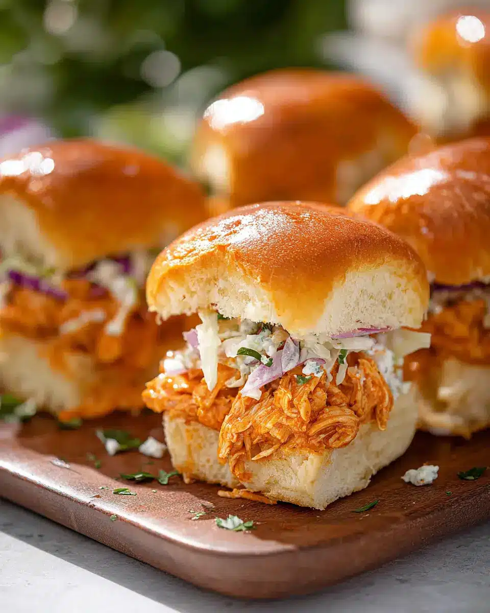 Once your buffalo chicken sliders are out of the oven, let them cool for a minute—patience is key! Serve them warm, and if you made a fresh coleslaw, feel free to top your sliders with it or serve it on the side. These bites are sure to disappear quickly!