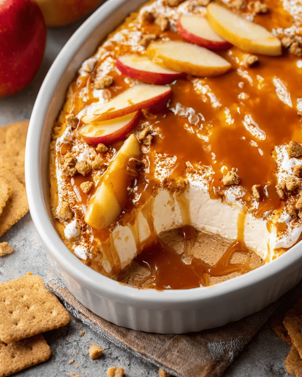 - Layered display: Serve the Caramel Apple Cheesecake Dip in a clear bowl atop a decorative plate with dippers arranged around it.