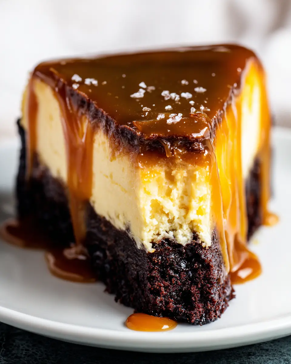 Once chilled, carefully release it from the springform pan, slice, and drizzle with homemade or store-bought salted caramel sauce. Enjoy your Caramel Brownie Cheesecake with friends and see their smiles light up!