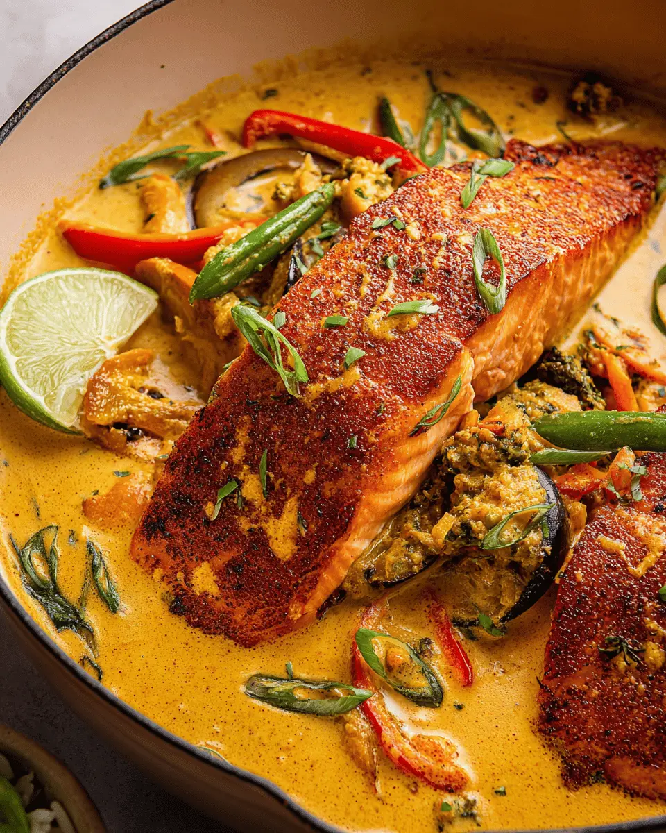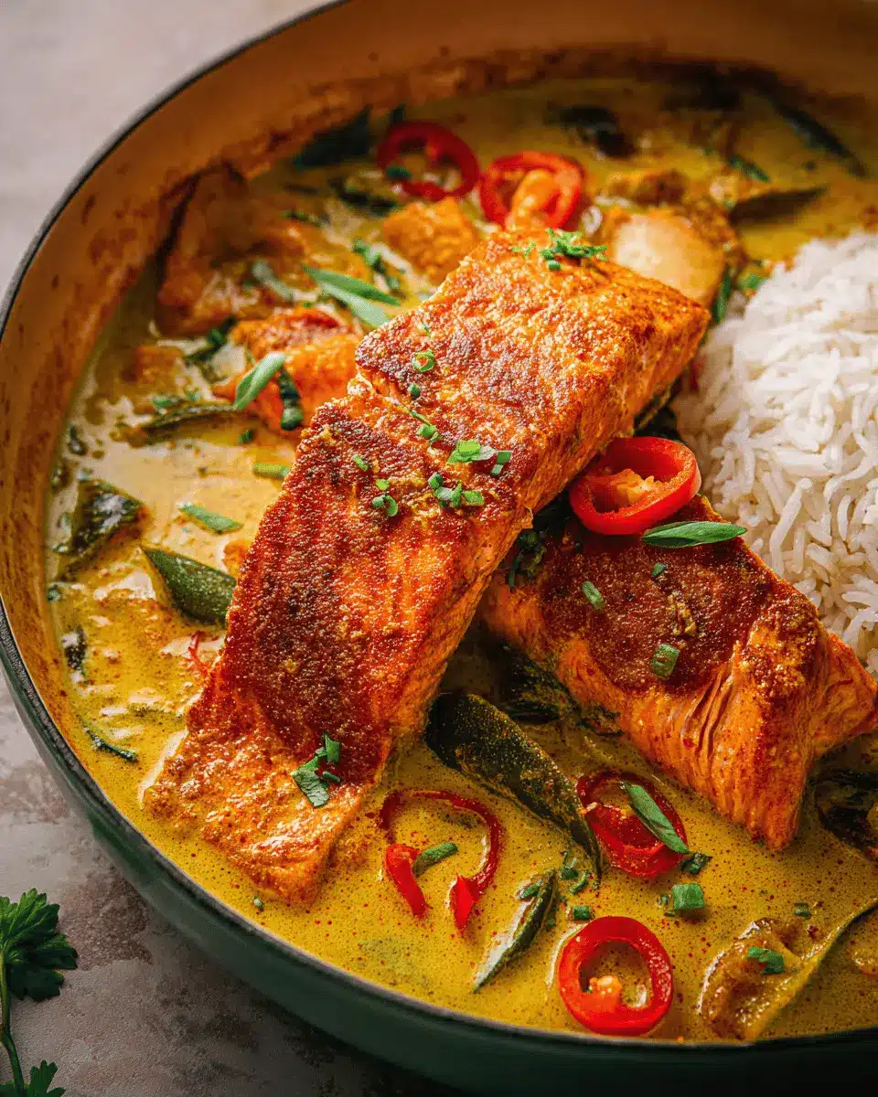Imagine diving into tender salmon fillets coated in a savory curry sauce, complemented by the crunch of bell peppers and the subtle kick of garlic. The flavors aren't just delicious; they also offer health benefits. Salmon is loaded with essential nutrients that support heart health, while spices like curry and ginger can boost your metabolism and add anti-inflammatory properties to your meal. Plus, cooking with coconut milk provides a delightful creaminess without the dairy—making this dish a versatile option for various diets.