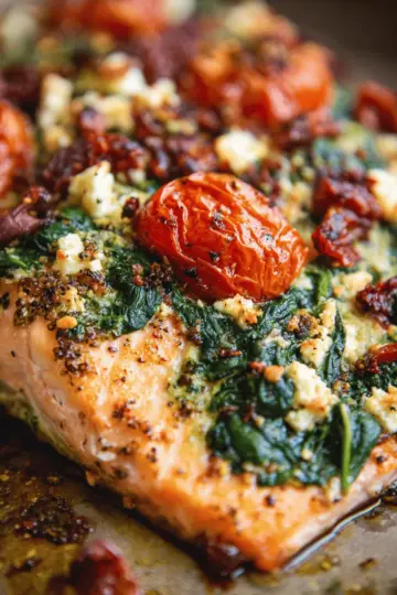 Tomato and Feta Baked Salmon: Easy Recipe with Spinach and Turkey Bacon