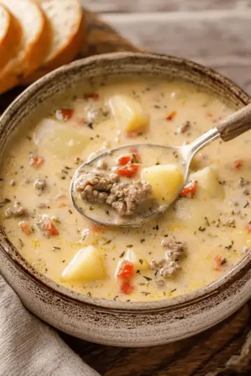 Easy Creamy Potato Hamburger Soup with Turkey Bacon Delight