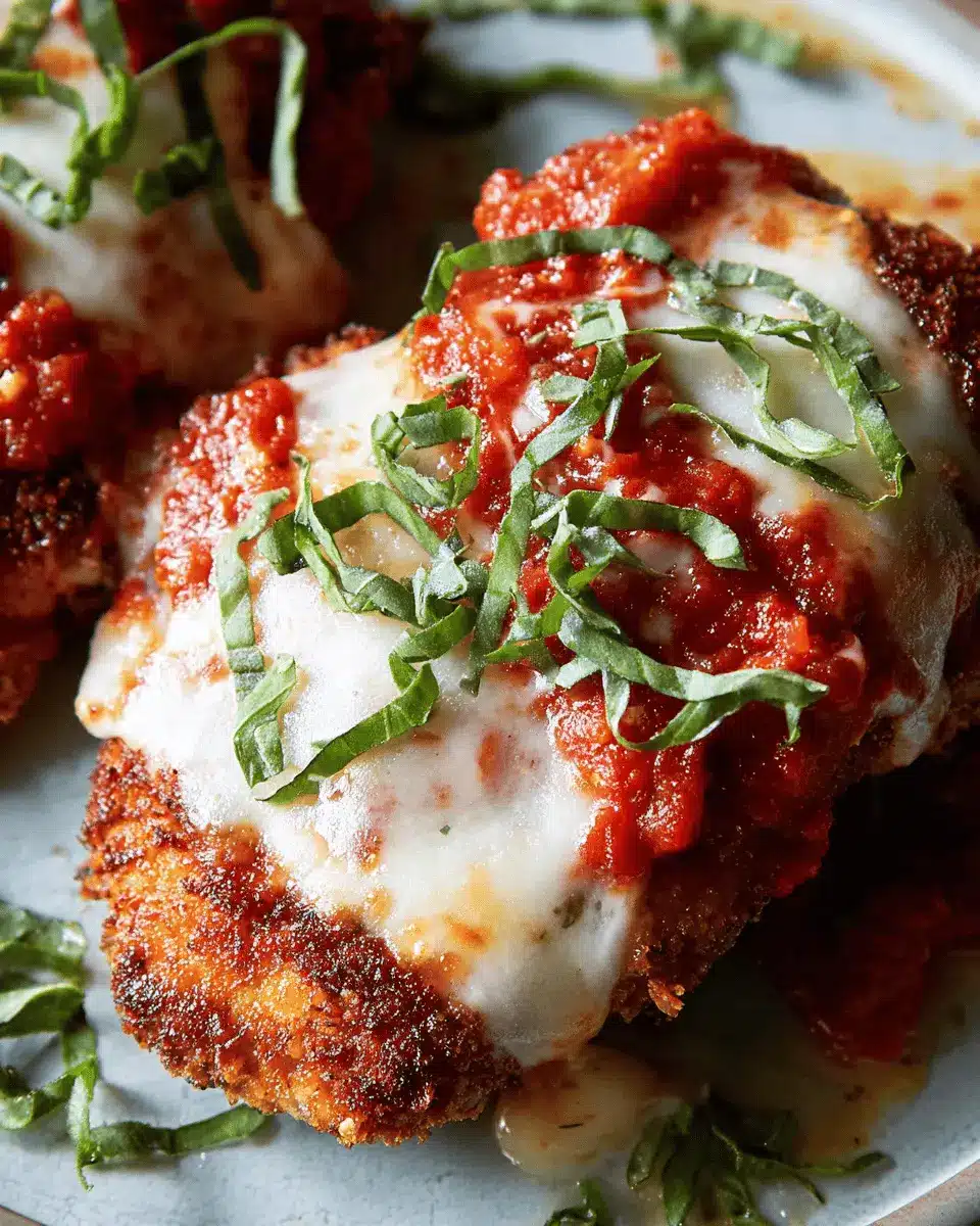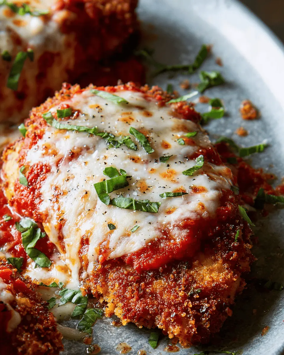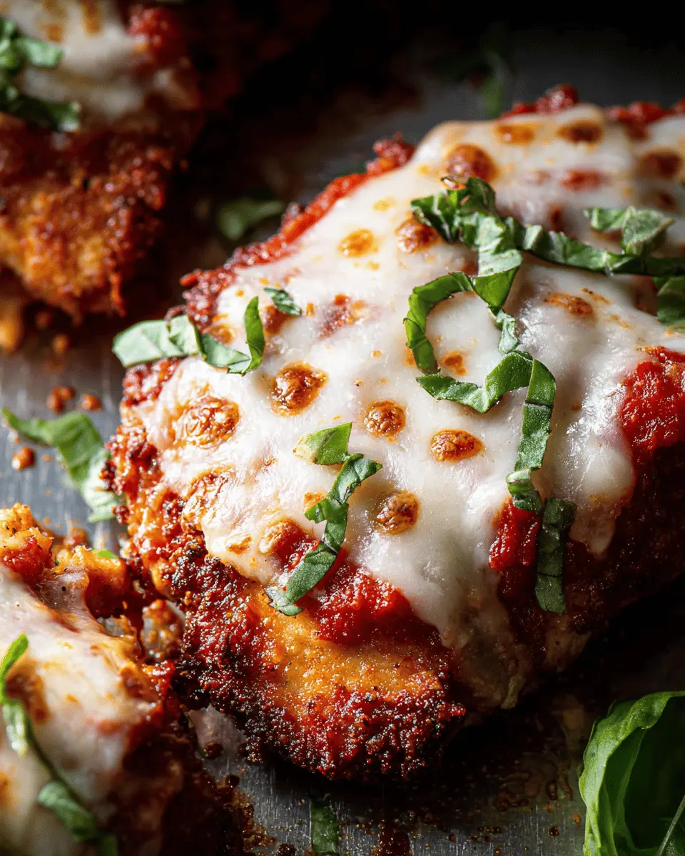 Finally, pop your assembled Chicken Parmesan under a broiler for about 2 minutes. Keep a close eye on it; you want that cheese to melt and develop beautiful brown spots. Once it’s golden and bubbling, remove it from the oven. Serve your dish topped with freshly chopped basil and accompanied by extra marinara.