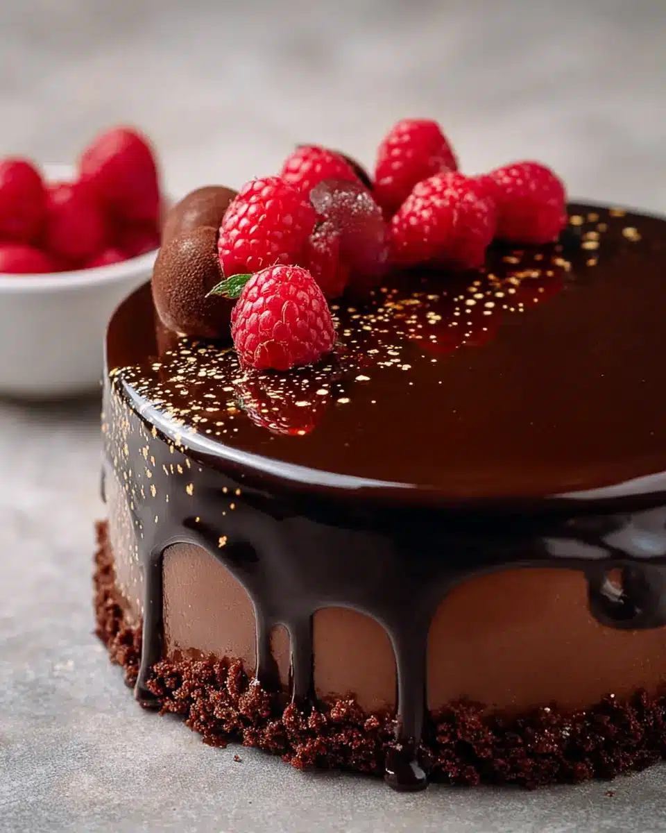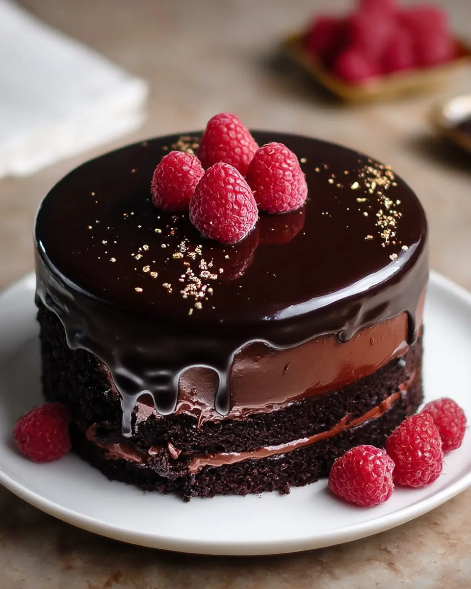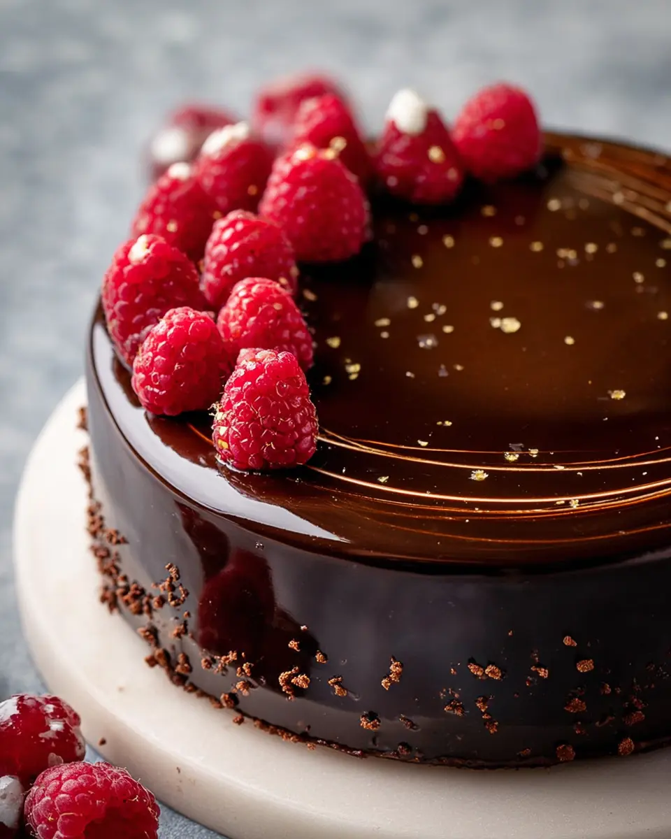 Chocolate and Raspberry Mousse Cake with Dark Chocolate Mirror Glaze