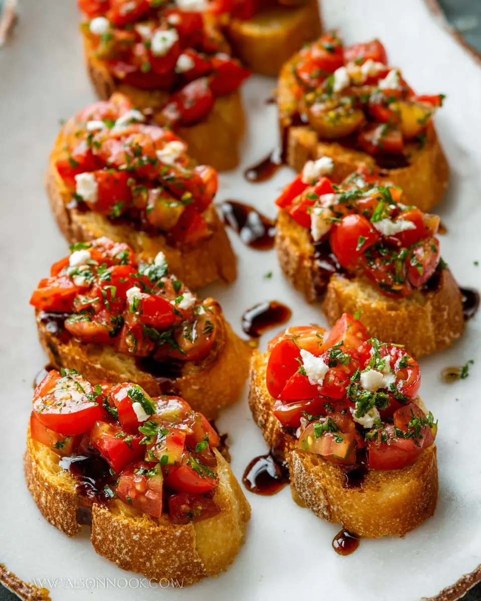 Once your toasts are ready, it’s time to wow your guests. Arrange the crispy toasts on a serving platter and spoon the marinated tomato mixture over each slice. For an extra touch, drizzle some balsamic glaze on top. Your classic bruschetta is now ready to impress! This delightful appetizer pairs beautifully with lemon-infused sparkling water or a refreshing herbal tea, making it a versatile dish for any occasion.