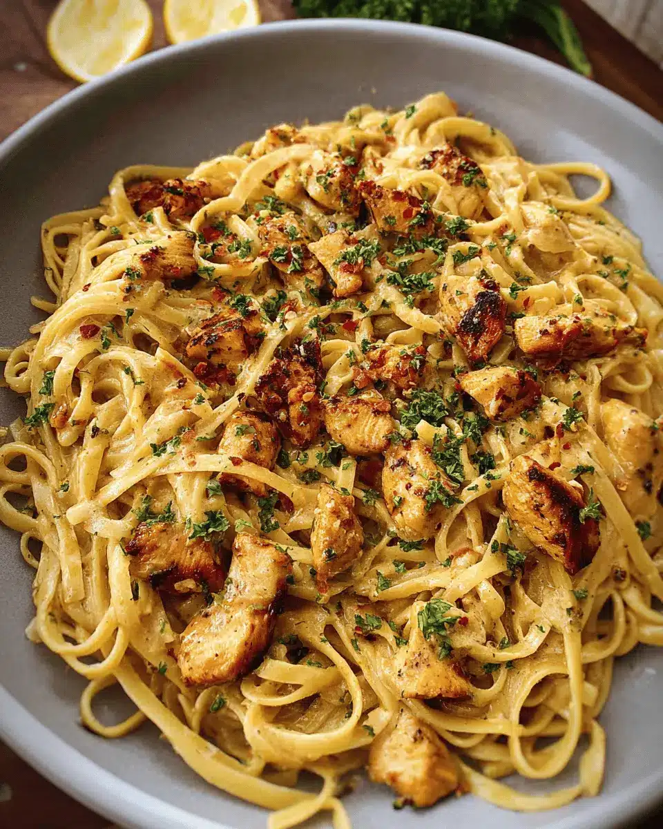 To plate your cowboy butter chicken linguine, serve it up in bowls and garnish with fresh lemon slices and a sprinkle of chopped parsley. Not only do these garnishes add a pop of color, but they also elevate the flavor profile. Enjoy your beautifully prepared dish with a side salad or some garlic bread for a complete meal. It's comfort food at its best, perfect for a cozy night in or an entertaining dinner.