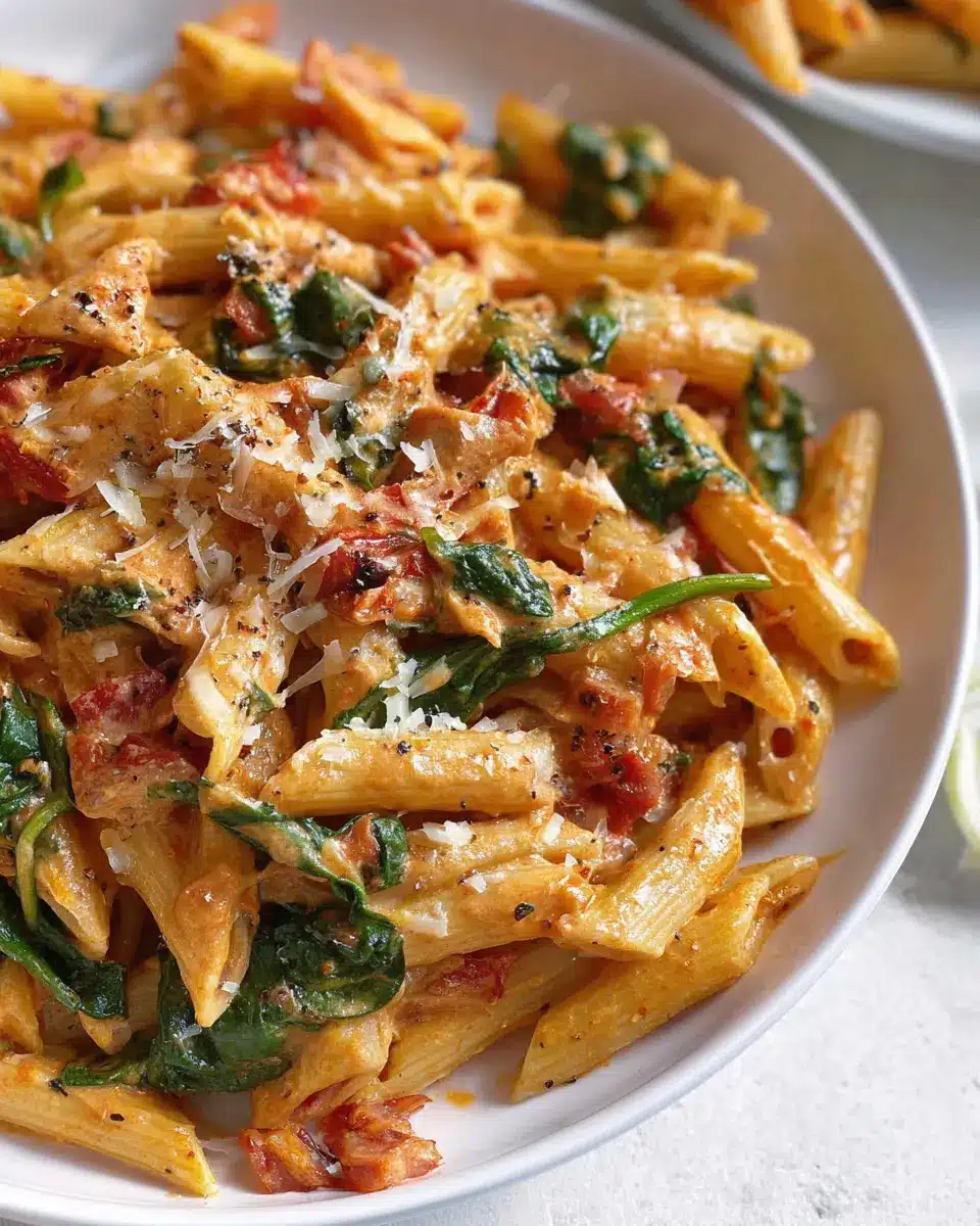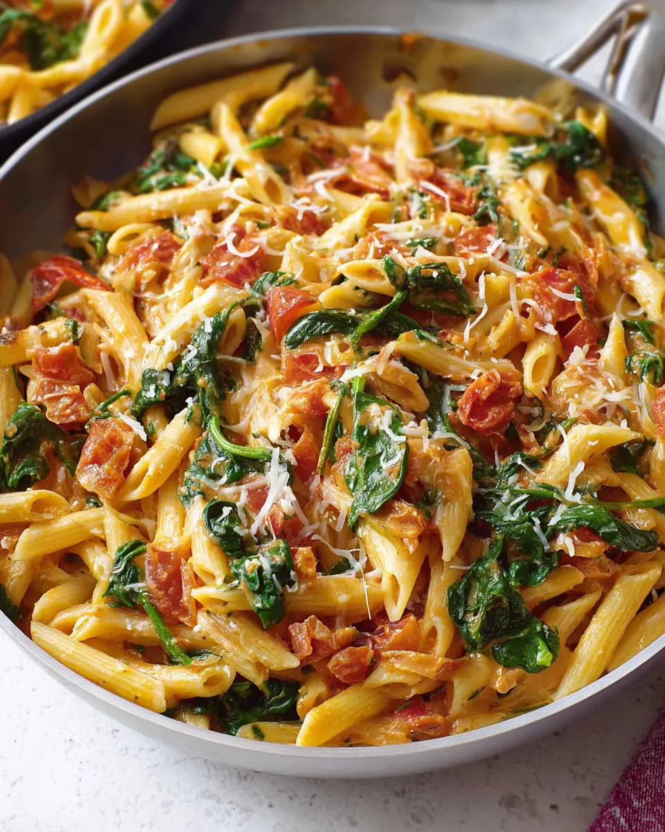 Finally, it’s all about bringing the components together. Gently fold in the fresh spinach until it wilts, about 2-3 minutes. You can then add the cooked penne pasta to the skillet, stirring until the pasta is evenly coated in your delicious creamy tomato and spinach sauce. Taste and adjust seasoning as necessary. Serve warm, garnished with extra Parmesan if desired, and enjoy the comforting flavors of your homemade creation!