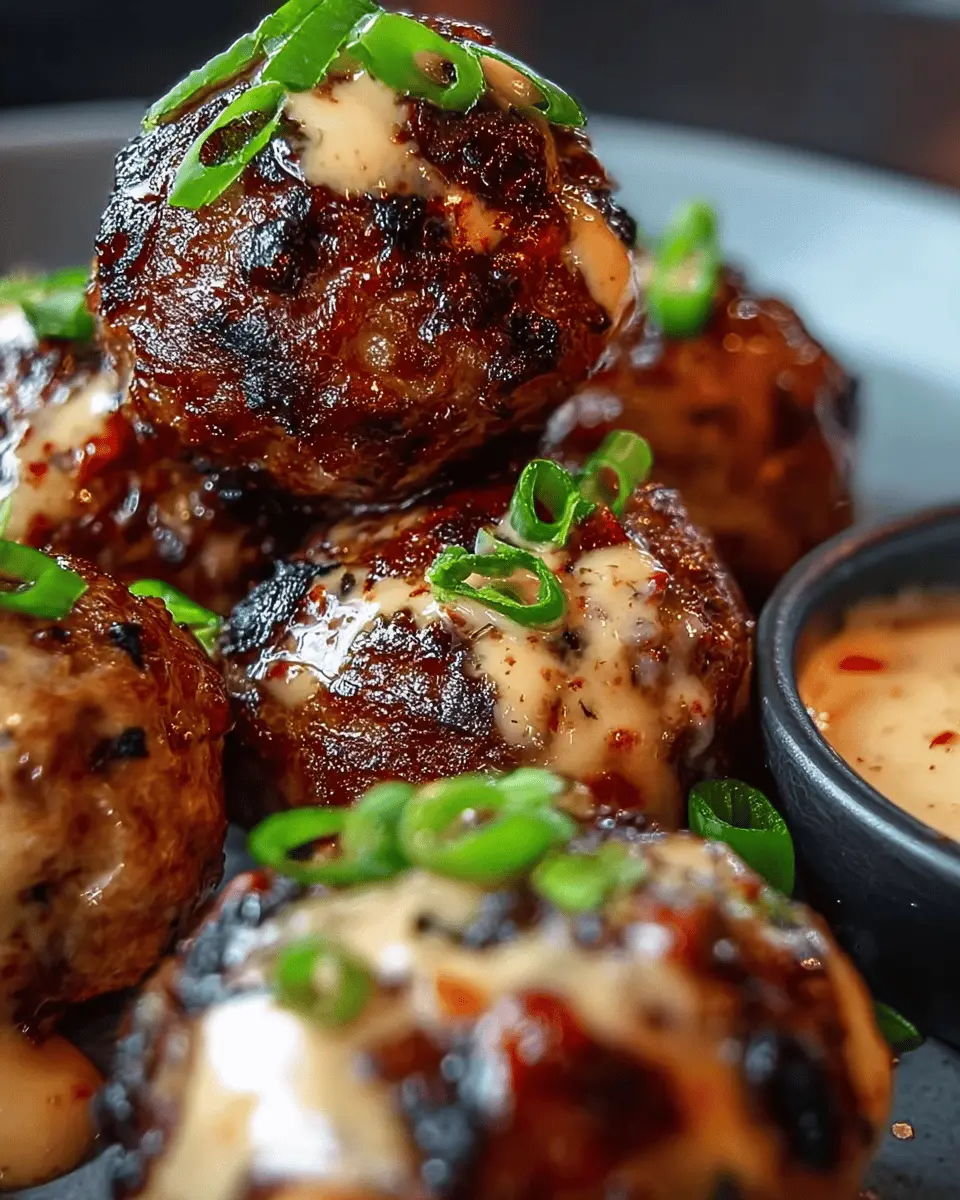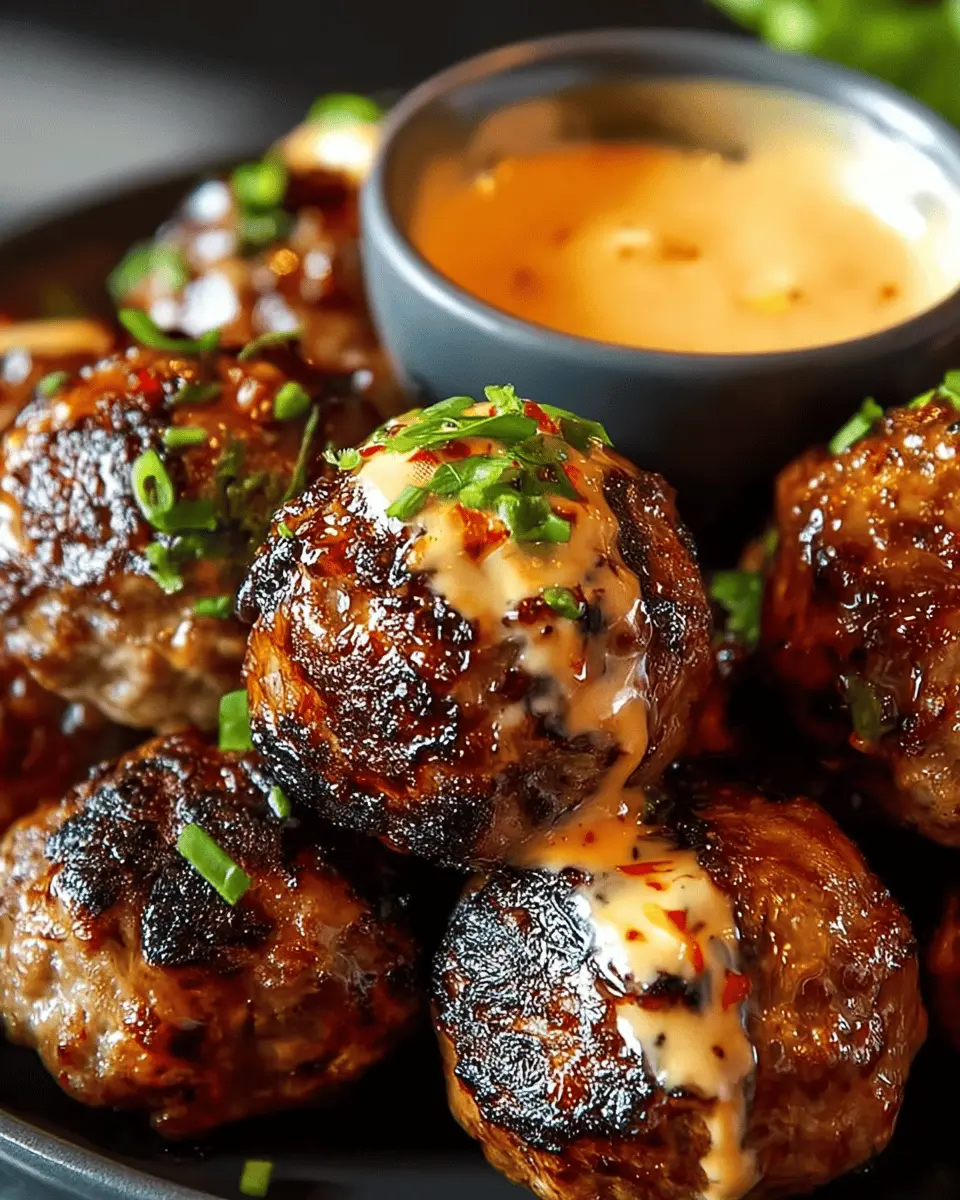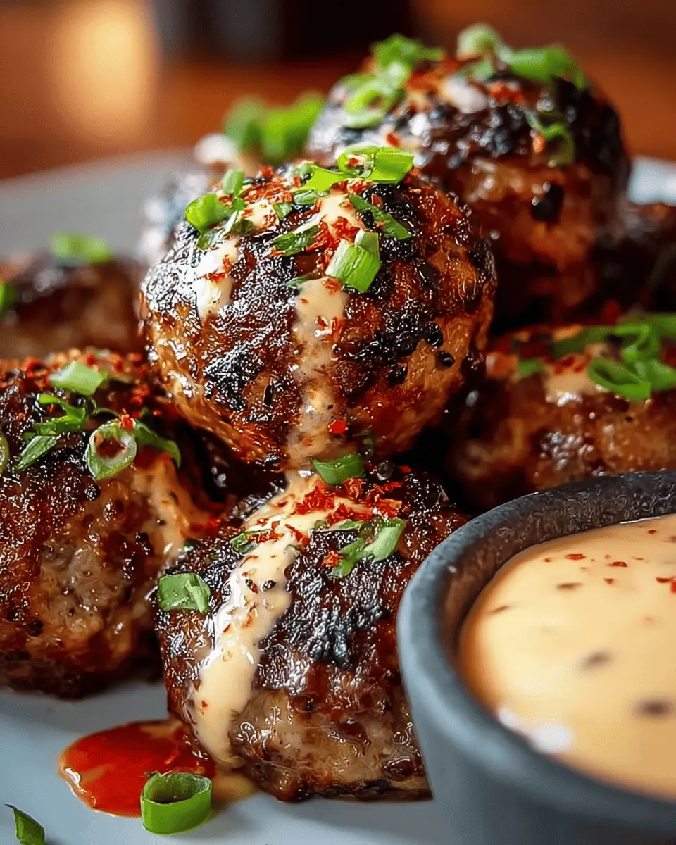 Elevate your serving game by presenting the meatballs on a skewer, drizzled with extra spicy mayo for an eye-catching display at your next gathering. You might also try plating them in a small cast-iron skillet for a rustic feel. Arranging them on a colorful platter with dipping bowls filled with spicy mayo dip not only looks inviting but also encourages sharing and interaction among guests.