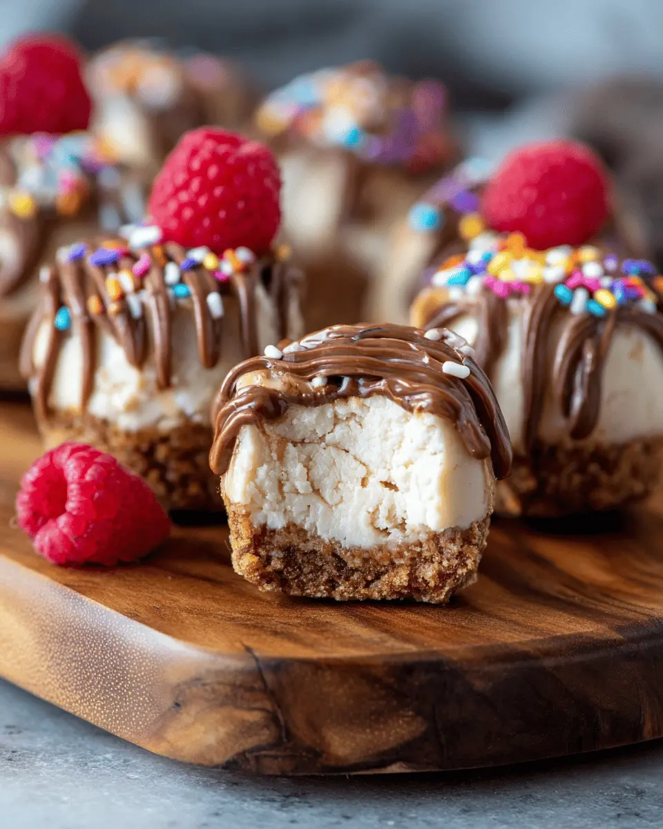 - Chocolate Drizzle: After dipping your no-bake cheesecake bites in chocolate, drizzle some melted white chocolate on top for an elegant touch.