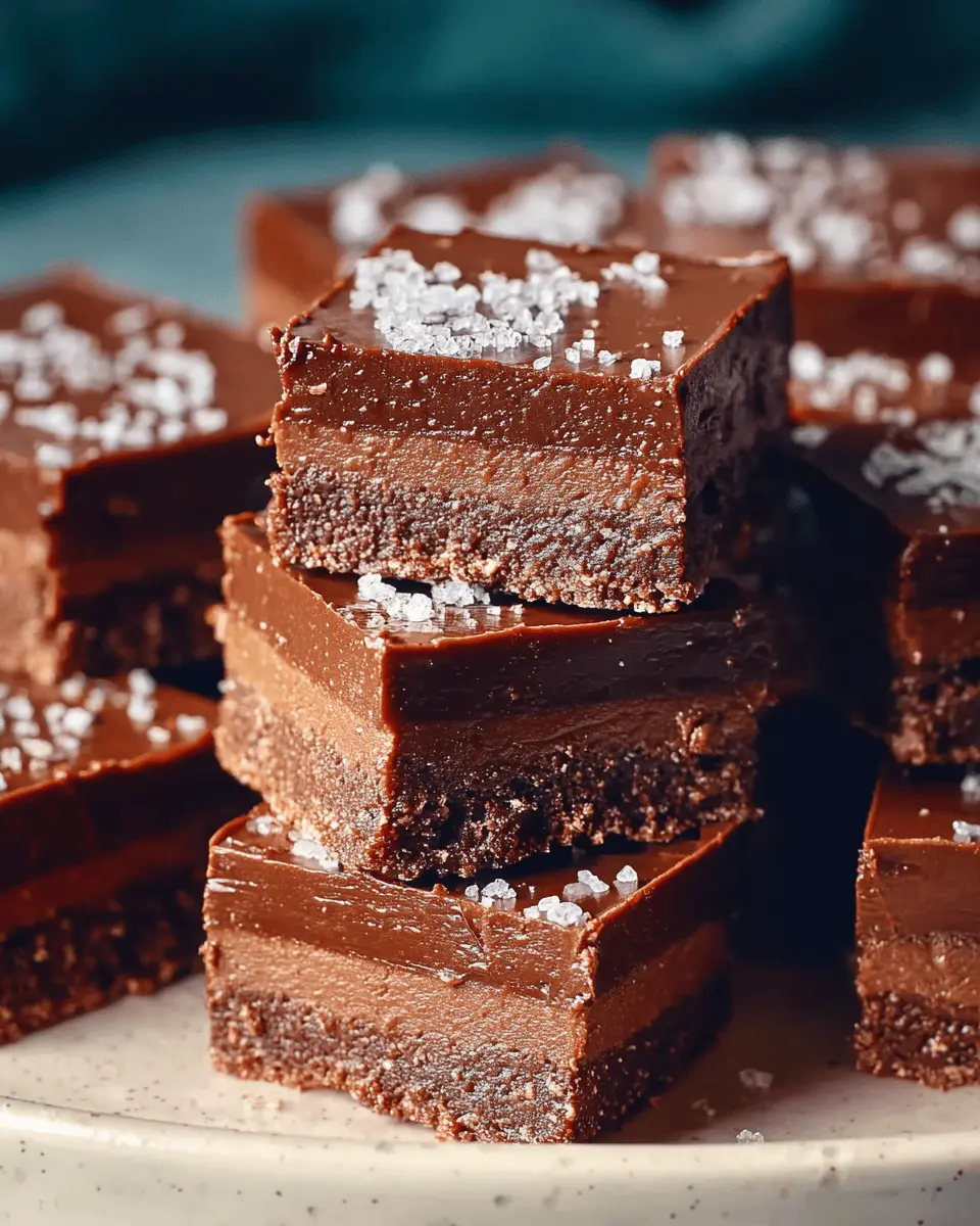 Once everything is set, sprinkle with flaky sea salt for that perfect finishing touch. Lift the parchment up to remove your no-bake fudgy chocolate squares from the pan and transfer them to a cutting board.