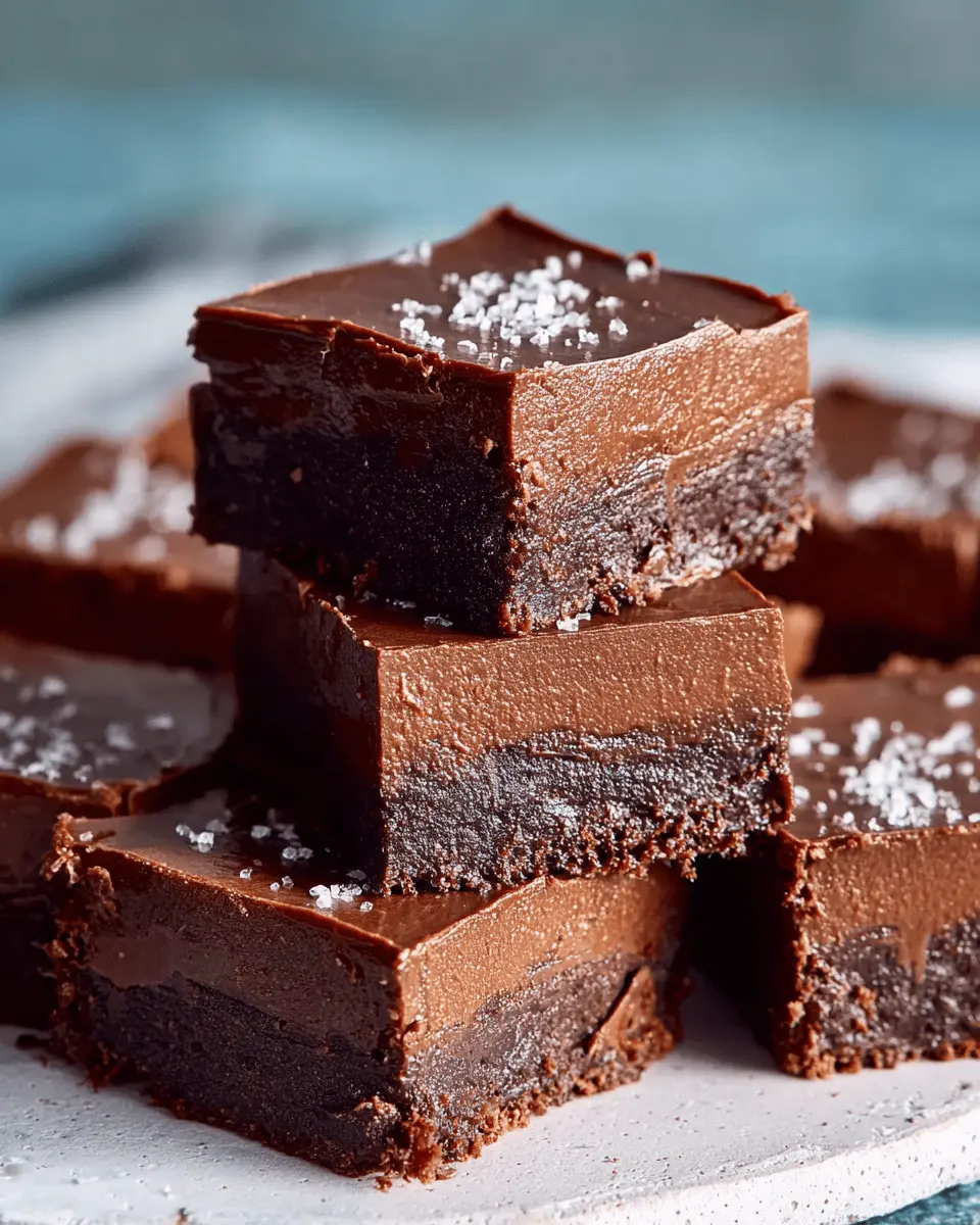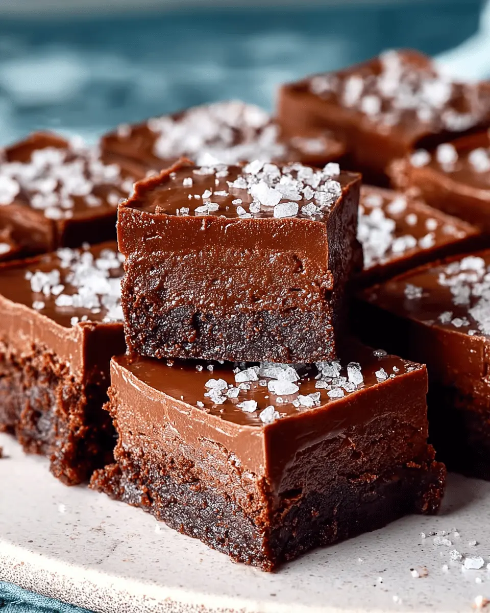 - In a medium microwave-safe bowl, combine remaining ½ cup chocolate and remaining 4 tablespoons butter. Microwave on high, stirring occasionally, until melted, about 1 minute. Stir until completely combined. Pour over chilled chocolate layer and spread into an even layer. Refrigerate, uncovered, until set, about 30 minutes. Sprinkle with flaky sea salt. Lift parchment to remove bars from pan, and transfer to a cutting board. Cut into 36 squares.