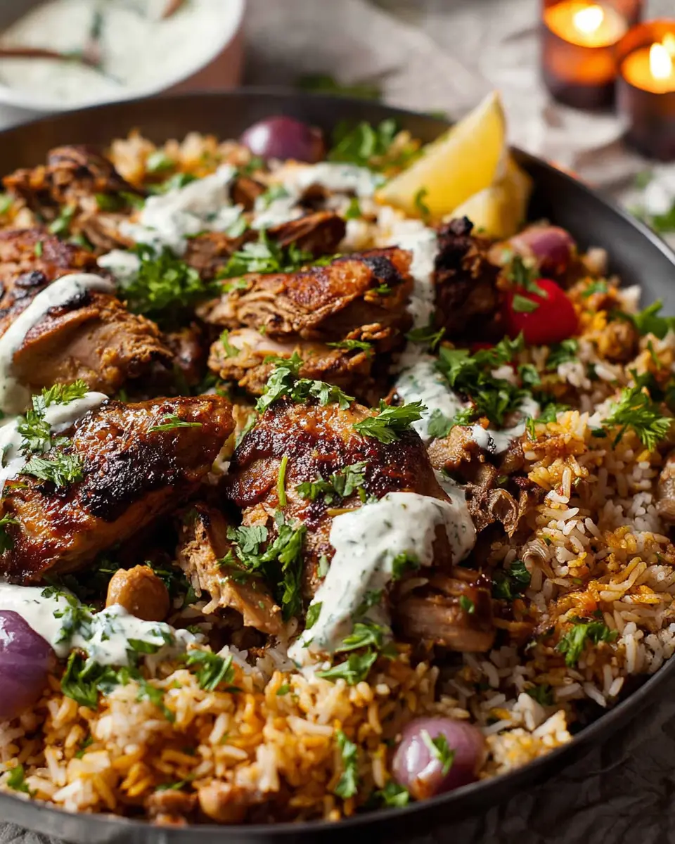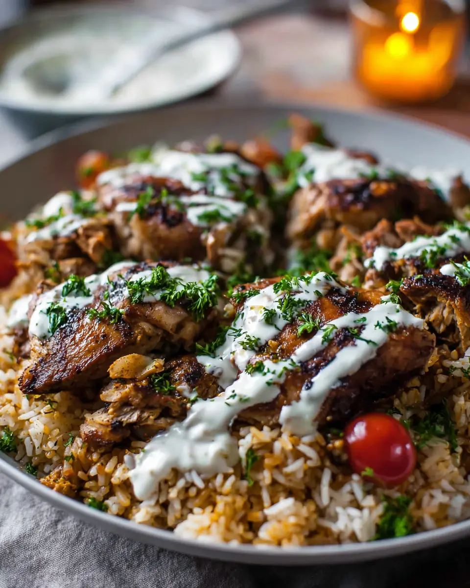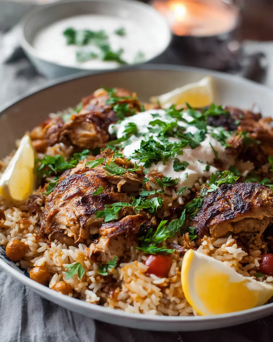 Presentation is key in making your meal not just tasty but also visually appealing. Consider garnishing your One Skillet Baked Chicken Shawarma and Rice with fresh chopped cilantro or parsley, adding a pop of color. You could serve in a large, shallow dish, scattering the raisins or sultanas for that sweet surprise. To add a touch of elegance, drizzle some plain yogurt on top or create a yogurt sauce for a flavorful finish. A sprinkle of sumac or paprika can also bring an extra dash of color and flavor, making your dinner not only delightful to eat but also a feast for the eyes.