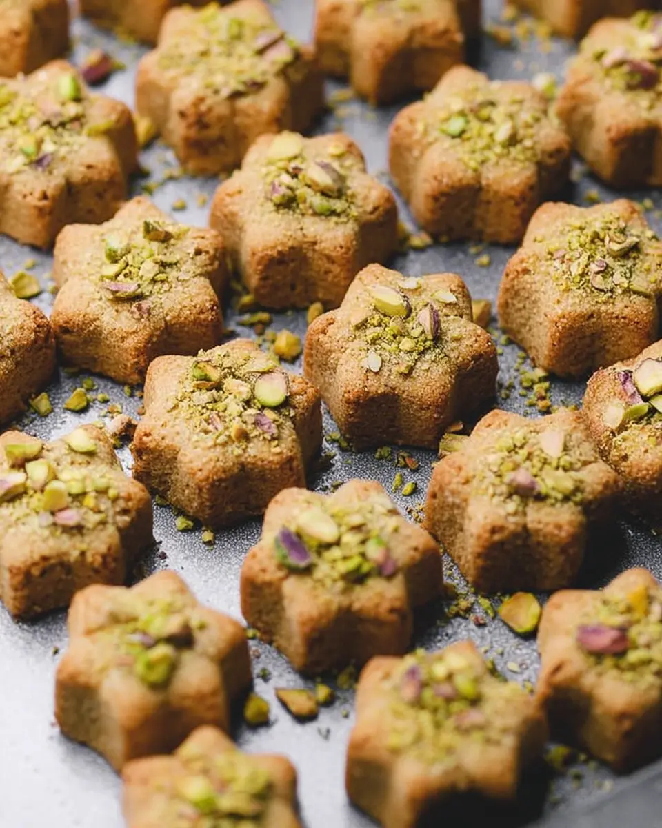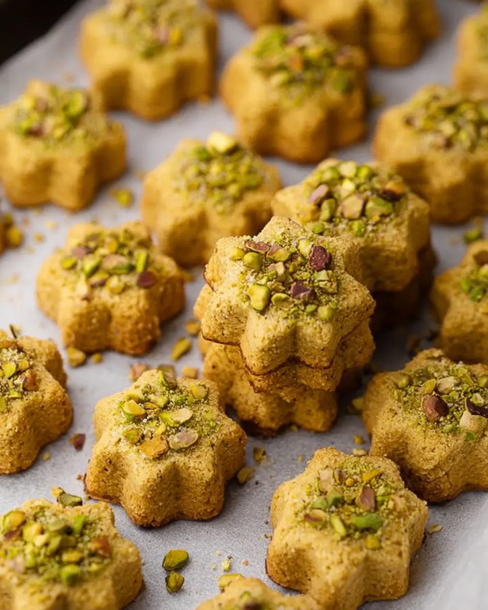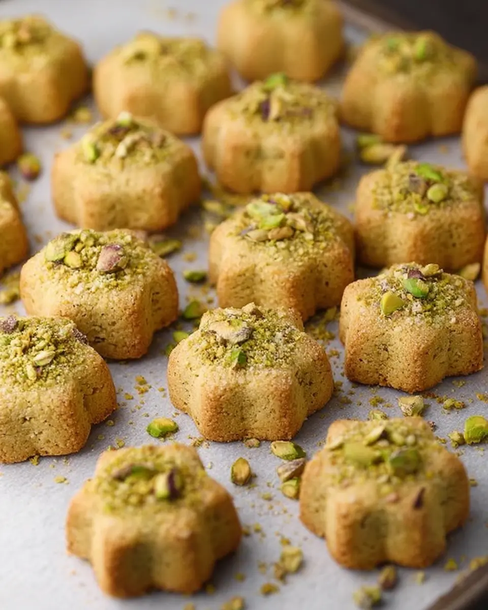 Before they go into the oven, sprinkle a few chopped or ground pistachios on top of each cookie for an extra crunch and nutty flavor. Place your baking tray on the middle rack and bake for about 15 to 20 minutes, until the cookies take on a lovely light golden color. Keep an eye on them — they can go from perfectly baked to overdone in a flash!