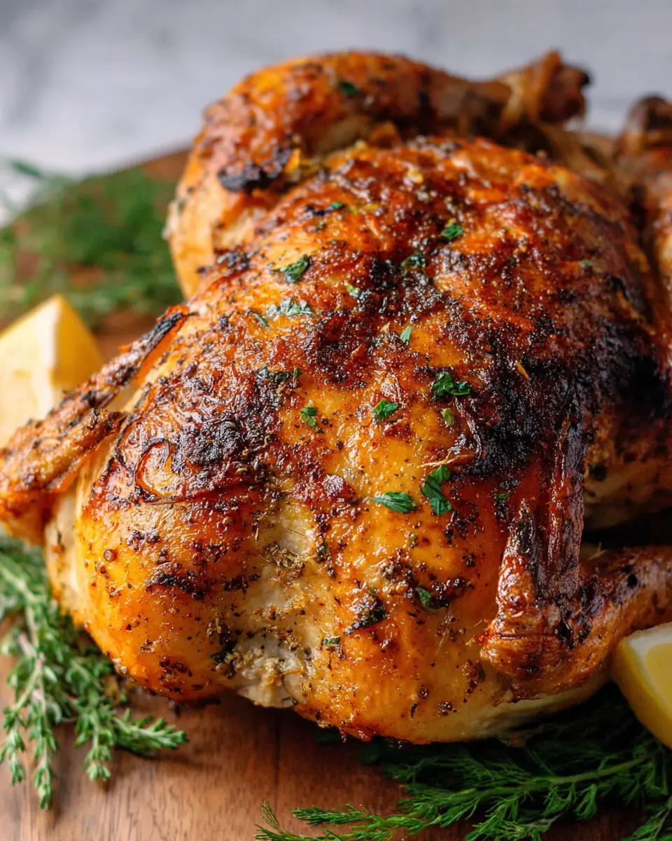 Now, let’s get this chicken into the oven! Preheat to 400°F and place your seasoned chicken breast side up in a large baking dish. Roast it until the skin is golden brown and a meat thermometer reads 165°F in the thickest part of the thigh, which usually takes about 60-75 minutes. The sizzling sounds in the oven? That’s your chicken transforming into a delightful centerpiece!