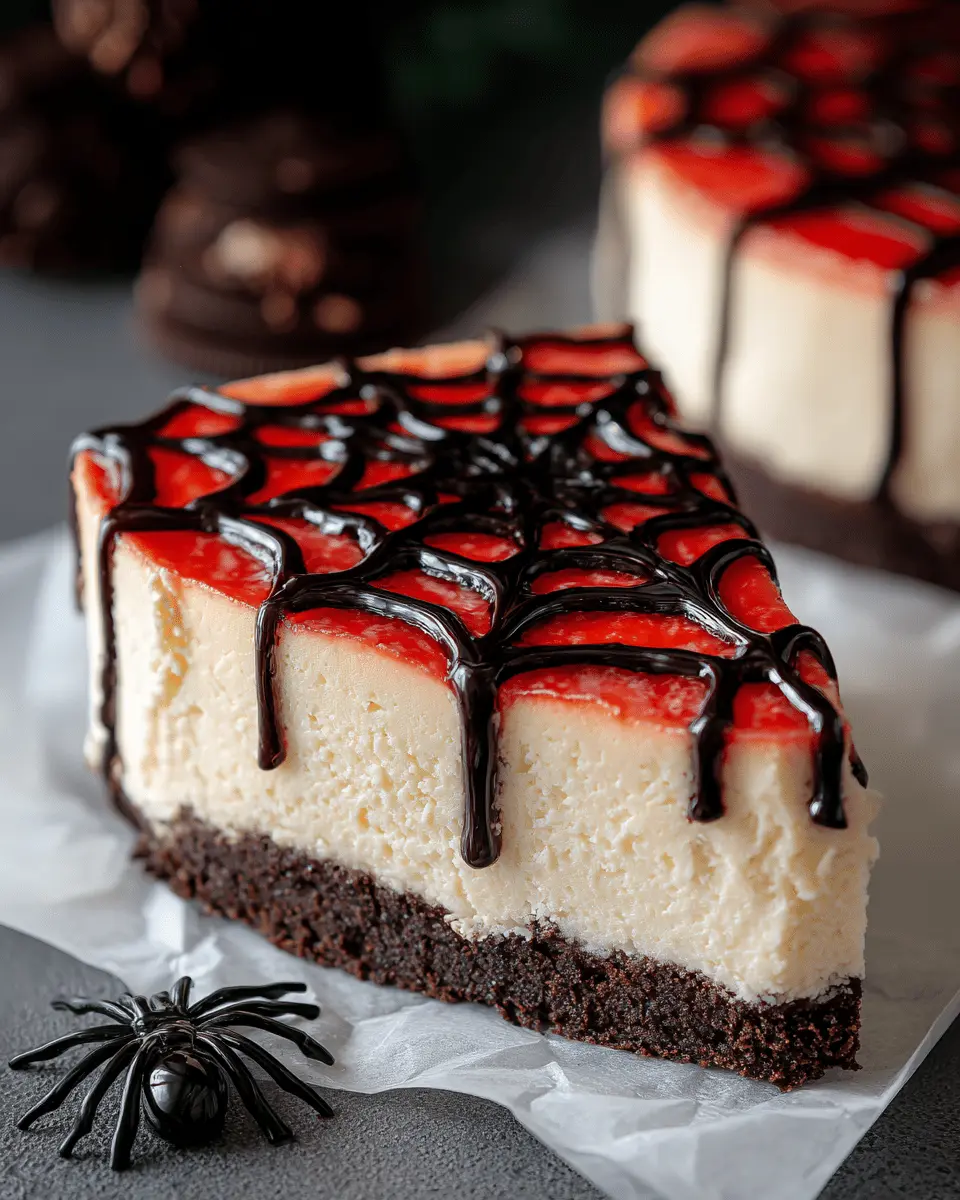 And there you have it! A spiderweb cheesecake that's as visually stunning as it is delicious. Serve this at your next gathering for a delightful surprise!