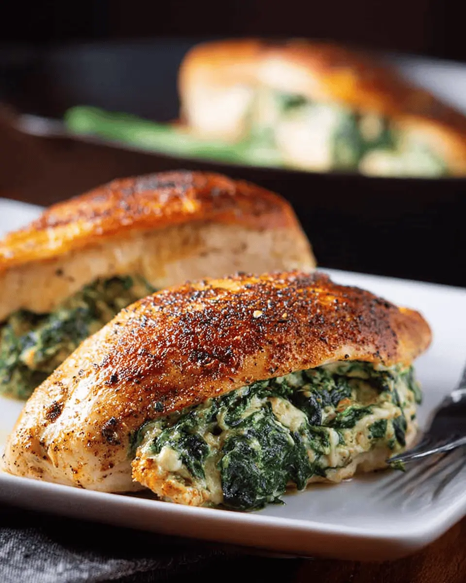 Prep your spinach stuffed chicken ahead of time! Assemble the chicken, then cover and refrigerate for up to 24 hours. When ready to bake, add a few extra minutes to your cooking time. For leftovers, reheat in the oven at 350°F for about 15 minutes to avoid drying out.