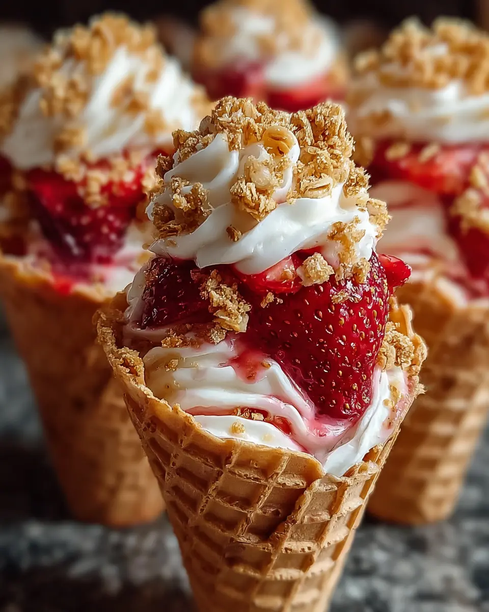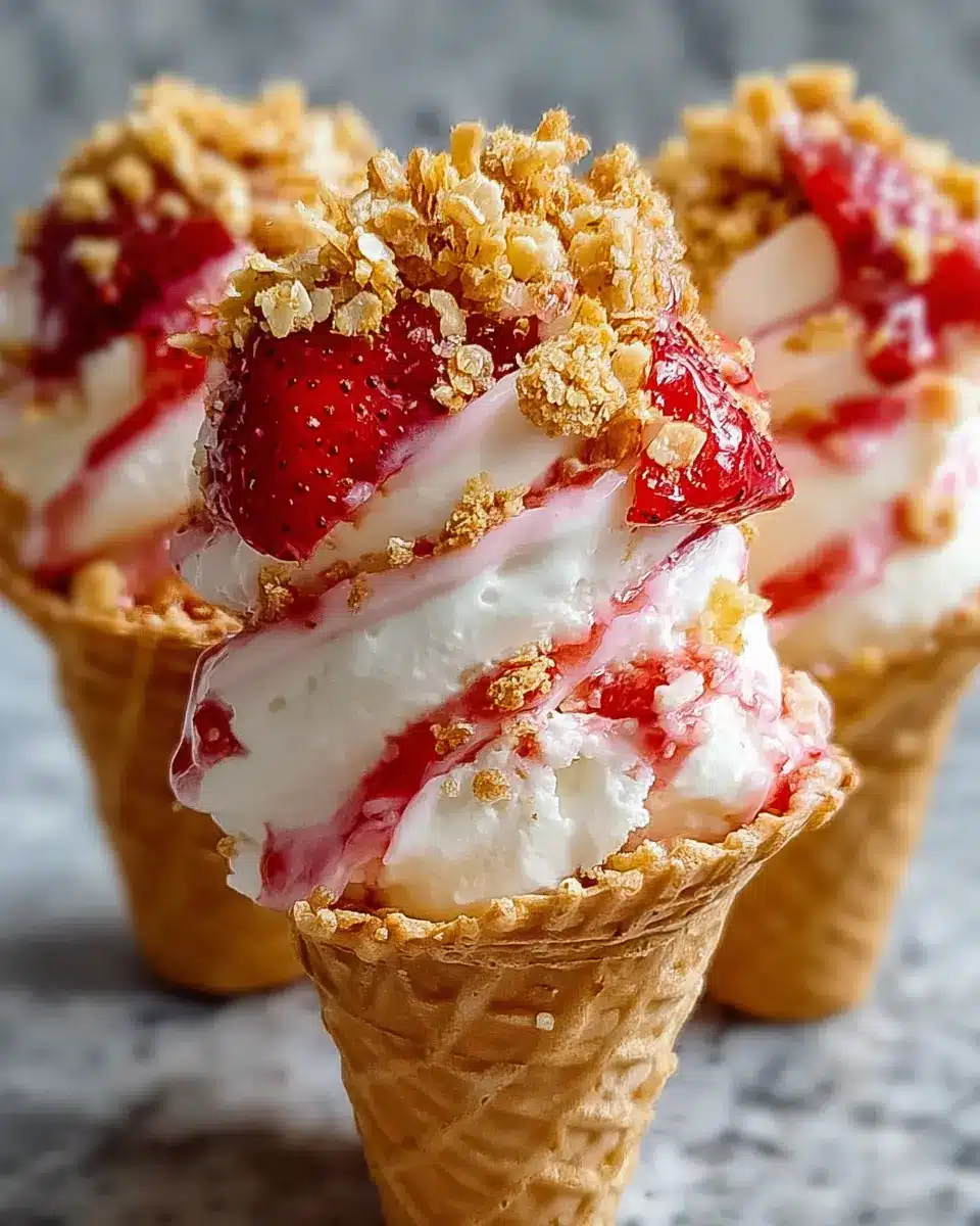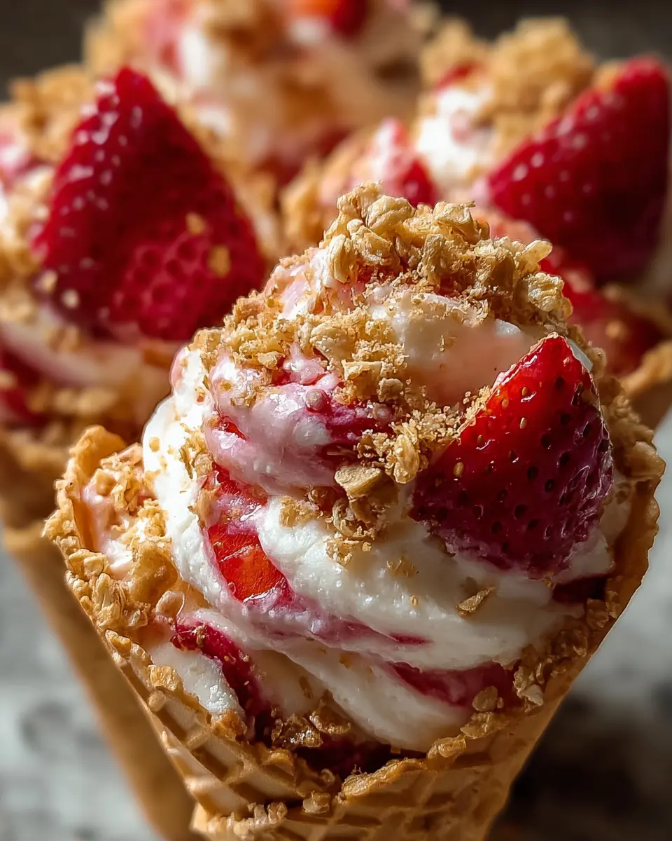 - Assemble the Cones: Using a spoon or piping bag, carefully fill each waffle cone with the cheesecake mixture, topping each cone with sliced fresh strawberries and a sprinkle of extra crunchy topping.